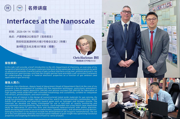 April , 2026 Professor Chris Blackman from University College London (UCL) visited our research group at the invitation of Professor Hou.They engaged in an academic exchange on nanoscale interface fabrication and advanced characterization, and discussed future international collaboration to explore new technological advancements.