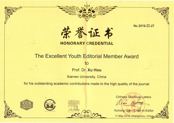 May, 2019 Congratulations to Professor Hou on winning the Excellent Youth Editorial Member Award for his outstanding academic contributions made to the high quality of Chinese Chemical Letters!
