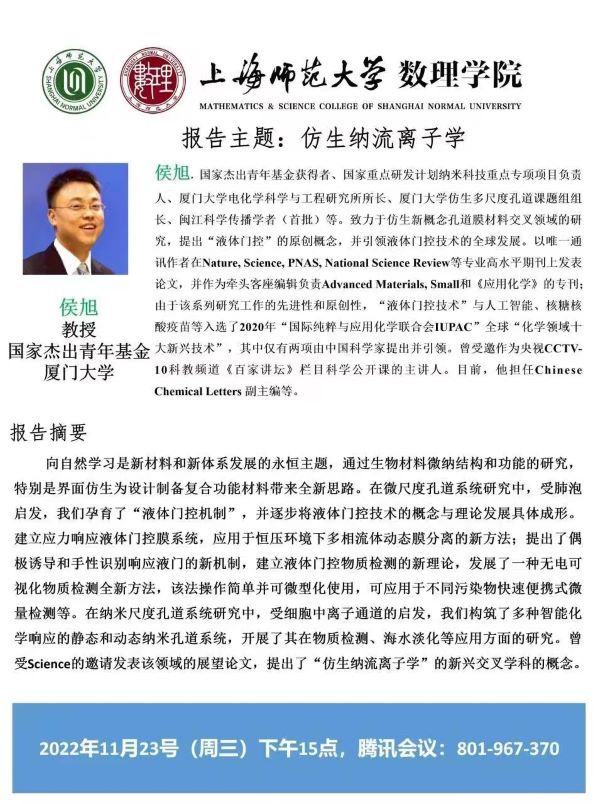 November, 2022 Professor Hou was invited by Shanghai Normal University to give an online academic lecture titled "Bioinspired Nanofluidic Iontronics".