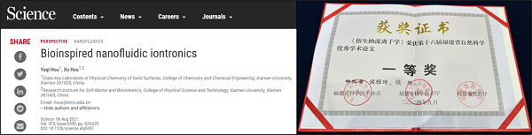 August, 2024 Congratulations to the paper "Bioinspired Nanofluidic Iontronics" (Science, 2021, 373, 628-629) which received the 16th Fujian Provincial Outstanding Natural Science Paper Award on August 14th!