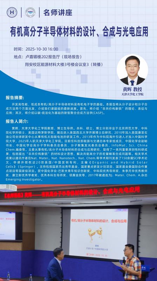 October, 2025 Professor Hou invited Professor Hui Huang from Tianjin University to lecture on "Design, Synthesis, and Photonic Applications of Organic Semiconducting Materials," in which he shared the latest advancements in organic semiconductor design and their optoelectronic applications.